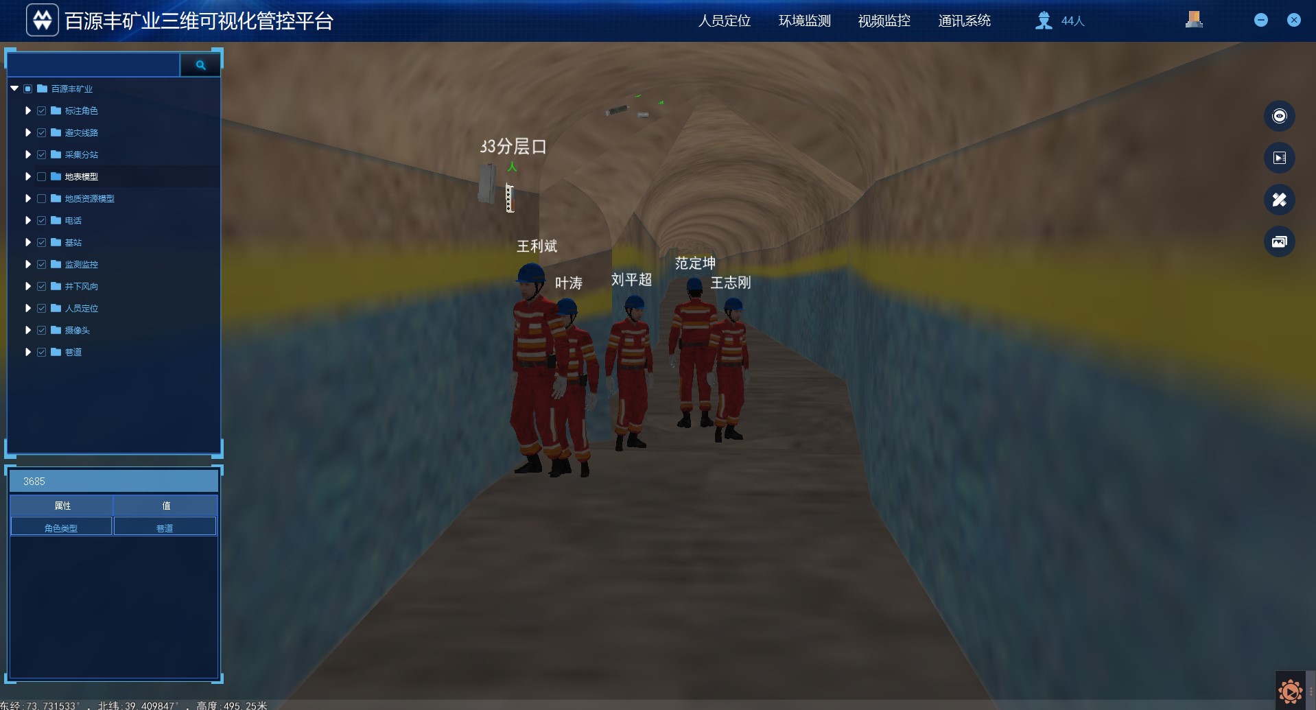 三維管控軟件平臺(tái)以礦山資源與開采環(huán)境三維可視化和虛擬環(huán)境為平臺(tái),利用三維GIS、虛擬現(xiàn)實(shí)等技術(shù)手段,將礦山地上地下場(chǎng)景、井巷工程進(jìn)行真實(shí)三維數(shù)字化建模,實(shí)現(xiàn)對(duì)礦山生產(chǎn)環(huán)境、生產(chǎn)狀況、安全監(jiān)測(cè)、人員和設(shè)備狀態(tài)的實(shí)時(shí)高仿真顯示。在真三維環(huán)境中集成礦山開發(fā)與運(yùn)行的相關(guān)信息,解決礦山信息化建設(shè)過程中基礎(chǔ)信息不足、信息孤島和可視化等方面的問題。